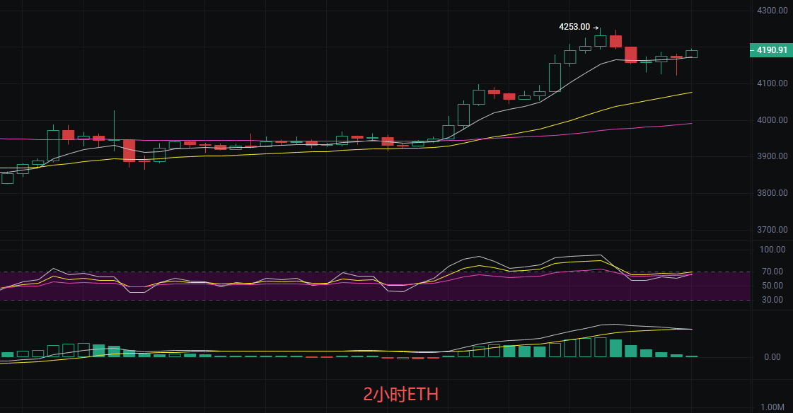 发稿前以太坊现价4190,丽盈观察目前盘口以太坊运行至强阻力位附近,技术面和外部环境均未提供明确的趋势性驱动信号。价格位于短期和长期均线之上,均线斜率向上,动能增强与看涨吞没形态形成共振短期反弹的可能性增加。然而,成交量极度萎缩,量价关系不健康,显示上涨缺乏有效支撑,回调风险不容忽视。2小时价格上行趋势,高点不断抬升,低点也逐步提高。MACD2小时动能增强。EMA呈现典型多头排列,支撑价格继续走强,思路上丽盈建议顺势多为主,空为辅