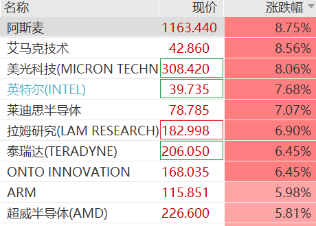 美股芯片股普涨,费城半导体指数涨超4.5%。阿斯麦涨超8%,创历史新高;美光科技、英特尔涨约8%,ARM、超威半导体涨近6%。