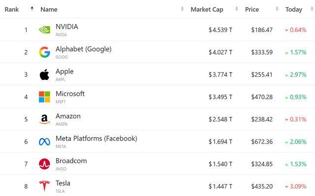 大型科技股多数收涨,(按市值排列)英伟达跌0.64%,谷歌C涨1.57%,苹果涨2.97%,微软涨0.93%,亚马逊跌0.31%,Meta涨2.06%,博通涨1.53%,特斯拉跌3.09%。