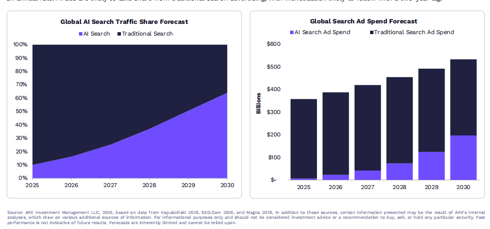 AI代理的兴起:报告指出,AI代理正在快速普及,预计到2030年将占据全球搜索流量的65%。这将改变传统搜索引擎的市场格局,为AI驱动的搜索平台和广告业务创造新的收入来源。