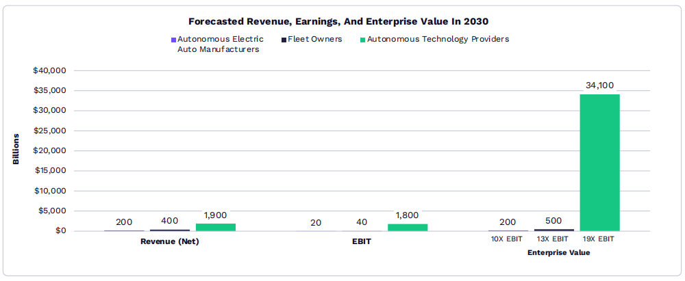 万亿美元市场前景:报告预测,Robotaxi技术平台到2030年可能产生约34万亿美元的企业价值,且其中大部分经济价值将被技术平台方获取。