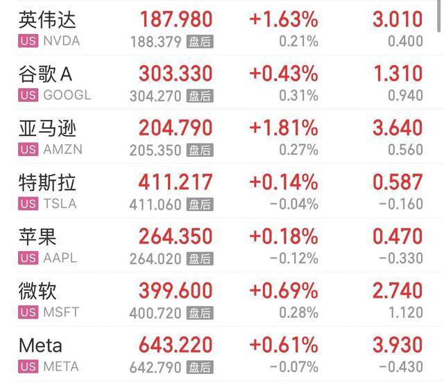 大型科技股普涨,英伟达、亚马逊涨超1%,苹果、特斯拉、Meta、微软小幅上涨。