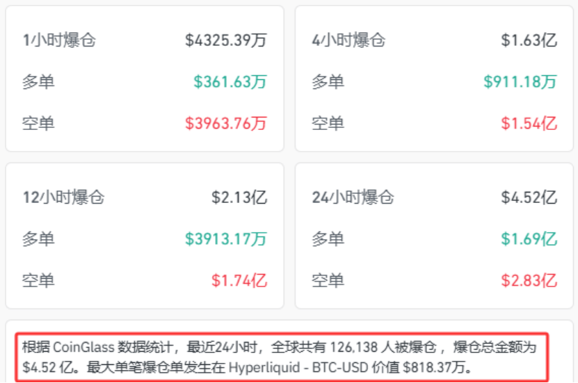 Coinglass数据显示,过去24小时,加密货币市场全球共有12.61万人被爆仓,爆仓总金额为4.52亿美元。其中,空单爆仓2.83亿美元,多单爆仓1.69亿美元。最大单笔爆仓单发生在Hyperliquid-BTC-USD,价值818.37万美元。