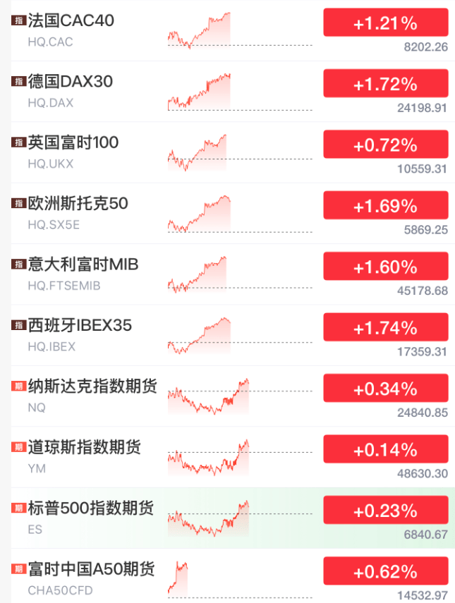 目前,欧洲股市集体上涨约1%,美股盘前也在反弹,富时中国A50期货指数涨约0.6%。