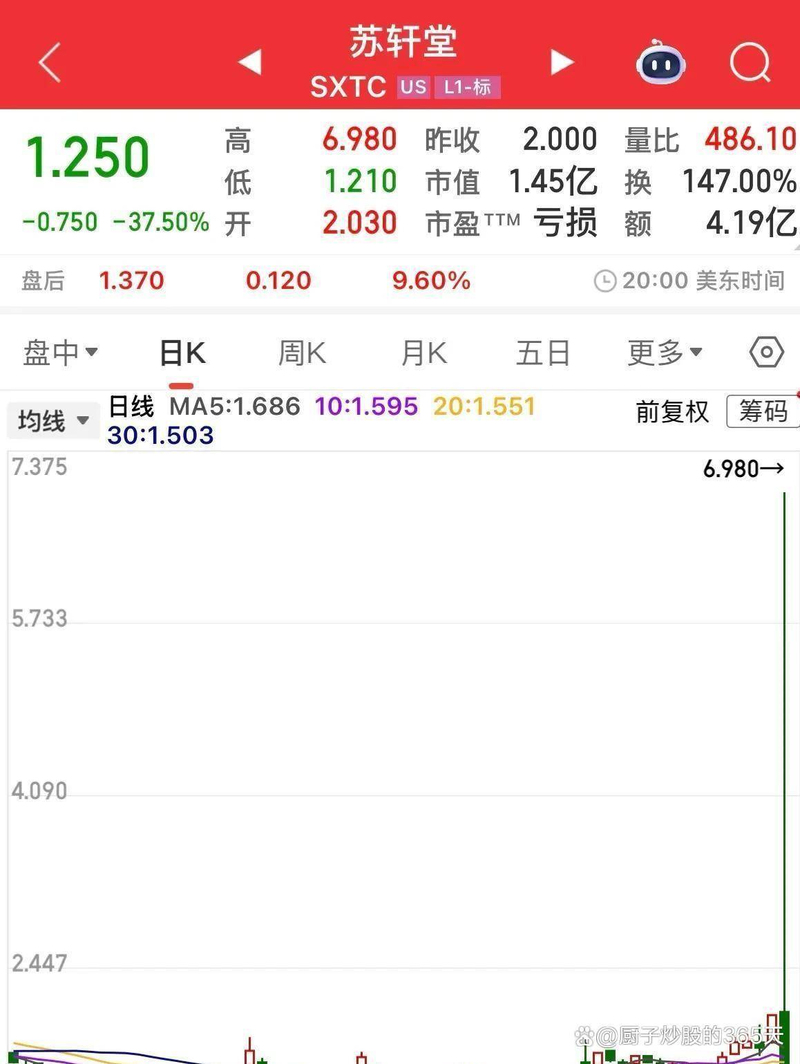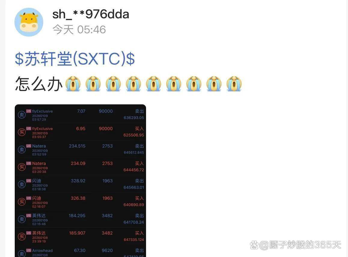 点击次数: 狗狗币,狗狗币走势,狗狗币怎么买,狗狗币在哪买,狗狗币价格,狗狗币挖矿,狗狗币官网,狗狗币交易平台,狗狗币钱包,狗狗币钱包下载,狗狗币最新消息,狗狗币注册,狗狗币开户,狗狗币下载网址,狗狗币APP两个小时,288.5%的振幅,一股民账户瞬间蒸发40万、这不是电影情节,而是2026年1月8日发生在中概股苏轩堂(SXTC)身上的真实戏码。 这家中药制剂公司因宣布启动“AI优化传统中药”计划,股价在开盘后一路狂飙,最高触及197%的涨幅并触发熔断。 然而,狂欢仅持续了10分钟,随后股价如自由落体般坠落,收盘时竟大跌37.5%。 一位在上涨83%时追涨19万股的投资者,两小时内眼睁睁看着本金缩水63%,最终亏损近40万元。