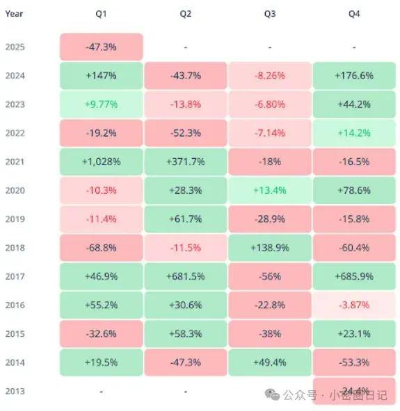 回顾2018年,狗狗币在第一季度和第二季度分别下跌68.8%和11.5%,但在第三季度逆袭,涨幅达到惊人的138%。如果今年第三季度能够复制这种涨幅,狗狗币有望弥补当前的亏损,甚至抵消可能的第二季度损失。不过,如果走势如2018年一样,第三季度的反弹可能会标志着今年牛市的顶峰。