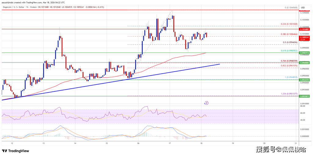 在狗狗币/美元(DOGE/USD)小时图上,一条上升趋势线 美元附近。狗狗币价格目前交易于 0.10 美元上方,且高于 100 小时简单移动平均线。上行的直接阻力位在 0.1015 美元附近。
