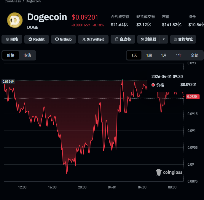 点击次数: 狗狗币,狗狗币走势,狗狗币怎么买,狗狗币在哪买,狗狗币价格,狗狗币挖矿,狗狗币官网,狗狗币交易平台,狗狗币钱包,狗狗币钱包下载,狗狗币最新消息,狗狗币注册,狗狗币开户,狗狗币下载网址,狗狗币APP先看这张CoinGlass 1天K线),信息量非常足:DOGE当前报价0.09201美元,24小时微跌0.18%,合约成交额21.64亿美元,现货2.12亿美元,市值约141.82亿美元。走势上,过去24小时DOGE走出一波经典的“深V反弹+高位震荡”结构,操作价值很高。