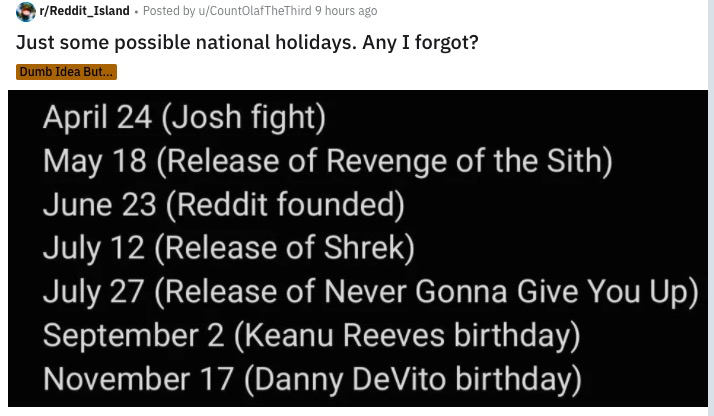 以下是某位网友对“梗图之国”的节日的提议,包括“Josh之战纪念日”、“贴吧创建纪念日”、“基努·里维斯生日”等等。