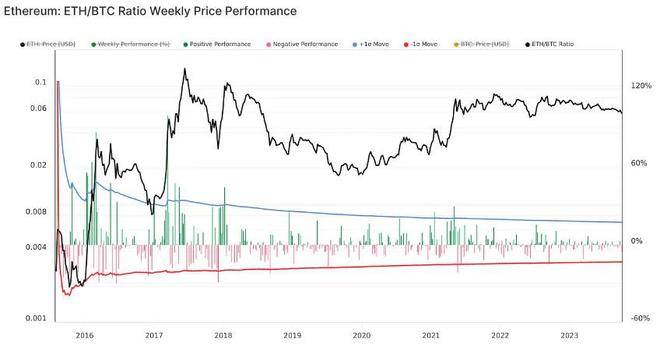 图中显示,自 2022 年 9 月合并以来, ETH / BTC 比率呈下降趋势,其中,根据数据显示:这份报告,比特币的主导地位和 ETH / BTC 比率将是至关重要的,以观察任何从比特币主导的市场机制向高风险资产的潜在转变。