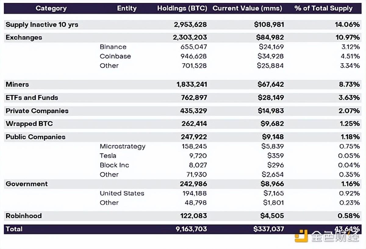 比特币的持有者包括从交易所到上市公司再到主要政府的各种机构。尽管这些群体的一些成员可能与其他成员有重叠,但大约40%的比特币总供应可以归因于可识别的所有权群体,如交易所、政府实体、上市公司和私人公司(例如,特斯拉和Block Inc.)、确保比特币网络安全的挖矿公司、ETF和其他上市基金、封装的比特币、消费者交易平台(例如,Robinhood)以及休眠地址。下面列举了这些群体。
