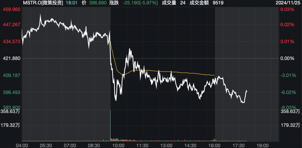 受到加密货币市场大跌影响,美股MicroStrategy当天大跌超4%。美股盘后,该股继续下挫,一度跌约4%。上周,有消息称该公司买入了超过5万个比特币。此前,随着特朗普胜选后比特币价格一路走高,该公司股价也节节攀升,累计最大涨幅超过100%。